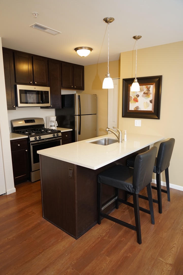 This all new one bedroom unit located on the third floor features a vaulted ceiling and contemporary living with a washer and dryer in your unit, all GE stainless style appliances, Quartz stone tops, an undermount kitchen sink and wood style plank floors. Amenities included in the contemporary kitchen include a gas range, frost free refrigerator and freezer with ice maker, microwave/vent hood, dishwasher and garbage disposal. Depending on the weather, you'll be glad to have gas heat and central air in your unit. Enjoy the great views from your balcony. Prairie Square is a gated community!